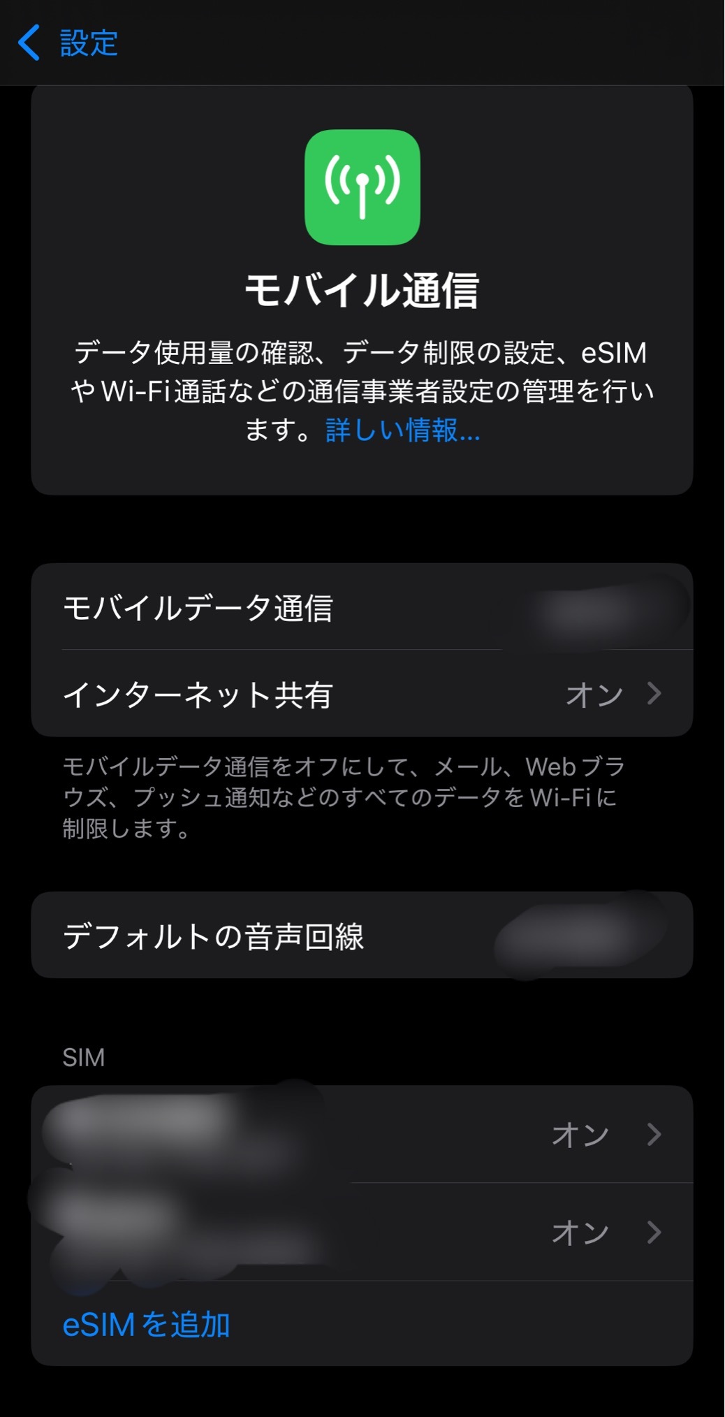 手順は簡単でアカウント作って料金を支払ったら日本にいるうちにeSIMをダウンロードしておく。こんな感じで「モバイル通信」の中に複数のSIM情報が並ぶ。