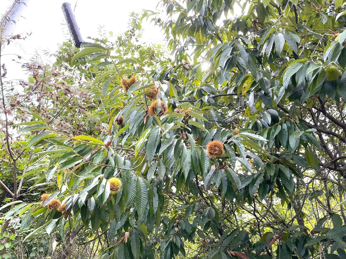 栗を拾う 素材 2025.10.02 10月に入りようやく秋らしくなってきました。秋はきのこ狩りにも忙しいのですが栗拾いもピークを迎えています。 隣のペイザナ中原ワイナリーにある大きな栗の木!とっても大きな木なのでペイザナの屋上で拾うんです。 いっぱいイガがついています。 熟れた栗からバラバラと落ちてくるのでほぼ毎日見に行ってこまめに拾います。ただ、たくさん拾いすぎると皮を剥くのが大変……。でも頑張って剥いています。 市販の栗よりは小粒ですが味がギュッと詰まっていて美味しいんですよ〜。お料理の付け合わせなどに活躍しますのでお楽しみに♪