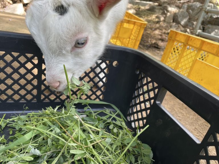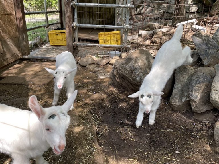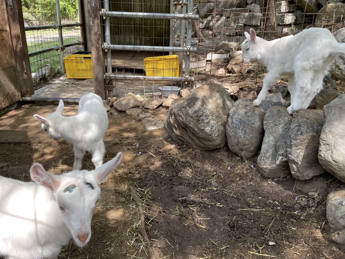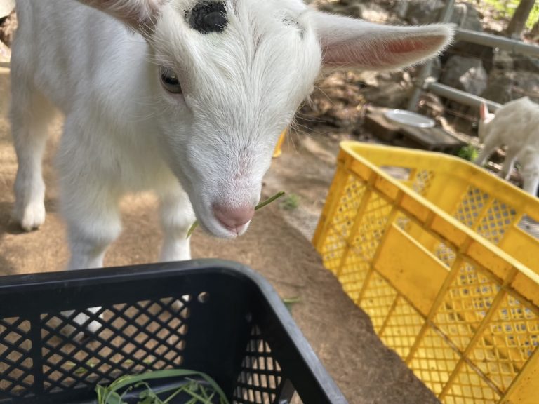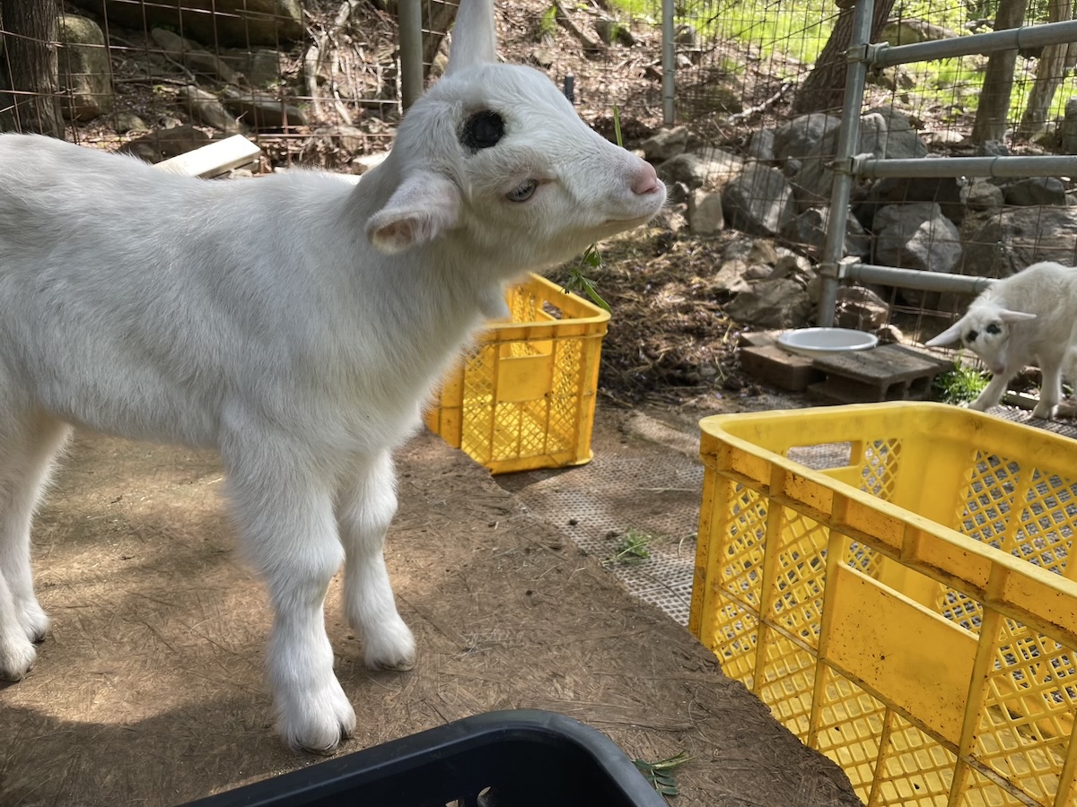 仔やぎ成長中 ヤギを飼う 2026.04.26 3匹の仔やぎたちが生まれて三週間ほどが経ちました。一週間を過ぎたあたりで除角をしましたが特に問題はなさそうで元気いっぱいです。二週間目ぐらいには早くも草を食べることに興味を持ち始め、三週間も経つとちょっとずつもぐもぐし始めます。ほんとのヤギの成長って早いですね〜 小屋から出した時も走り回るスピードが早過ぎて捕まえるのが大変なんです。3匹が爆速で庭を駆け回り人間はそれを追いかけ回してヘトヘトです笑。大人のヤギなら美味しいものをチラつかせるとすぐに捕まるのに〜!