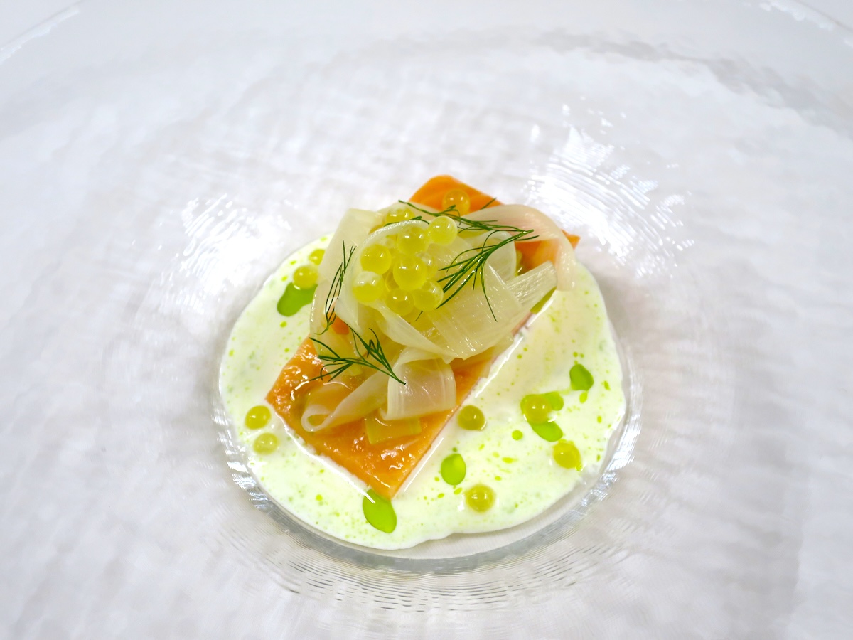 山梨県産の甲斐あかね鱒の低温コンフィとウドの甘酸っぱいマリネ。プチプチのヤマメの卵を添えて。