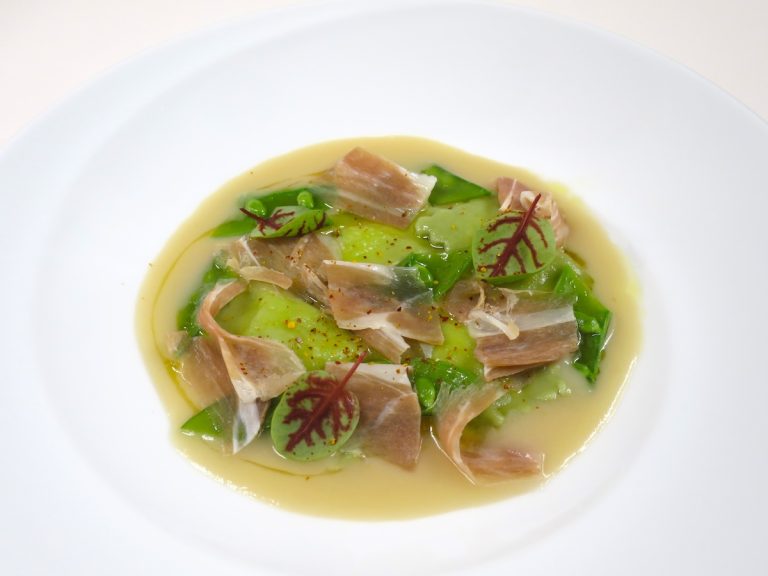 よもぎを練り込んだラビオリと塩気の効いた自家製の生ハムをやさしい白インゲン豆のスープで。