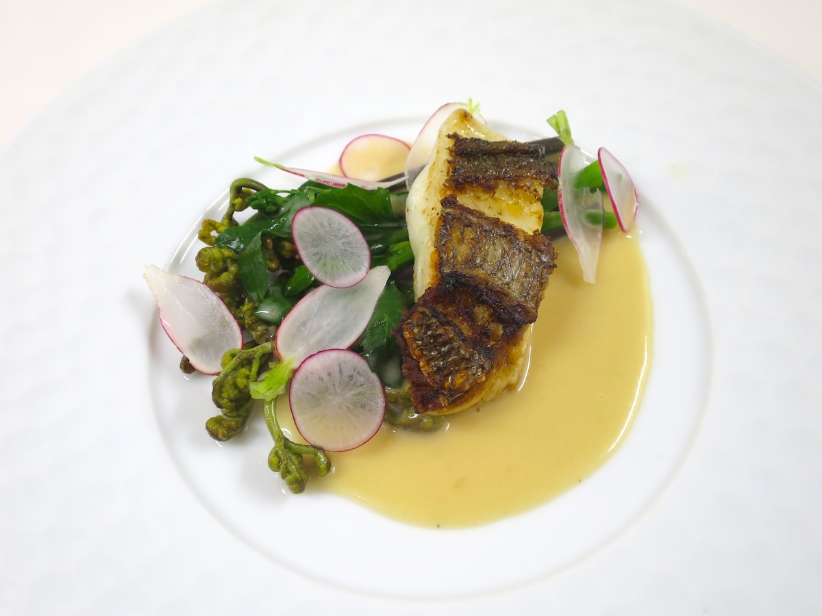 明石産天然真鯛のポワレ、たっぷりのわらびと菜の花とともに。