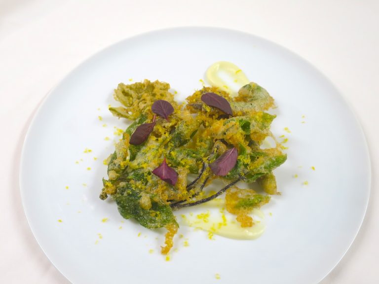 地元産の数種類の山菜とぶどうの新芽のベニエ。栽培の工程で「芽かき」されたぶどうの新芽はこの時期の産地ならではの味覚です。