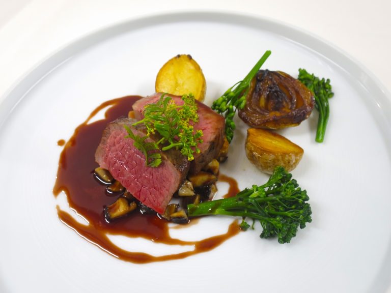 赤身が美味しい甲州ワインビーフのもも肉のローストに庭で採取した花山椒の鮮烈な香りを添えて。葉玉ねぎ、新じゃが、庭の原木しいたけもこの季節の味わい。