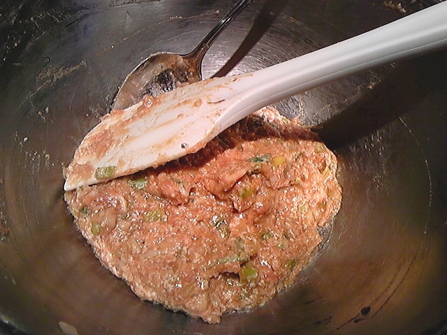 9、粘りが出てきたら(3)の野菜と調味料とごま油を加えよく混ぜる