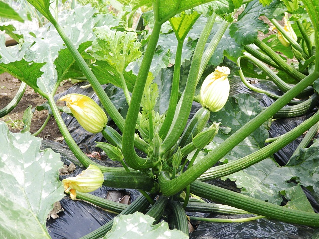ズッキーニもだんだん実が付いてきました。なかなか上手く受粉しないのでタイミングよく花粉をつけてあげると良く実るそうです。