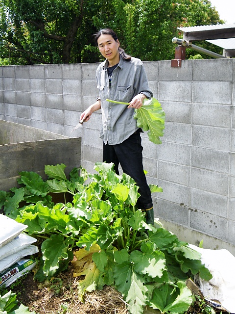 ルバーブを収穫するシェフです。今日と明日でジャムに仕上げる予定です。