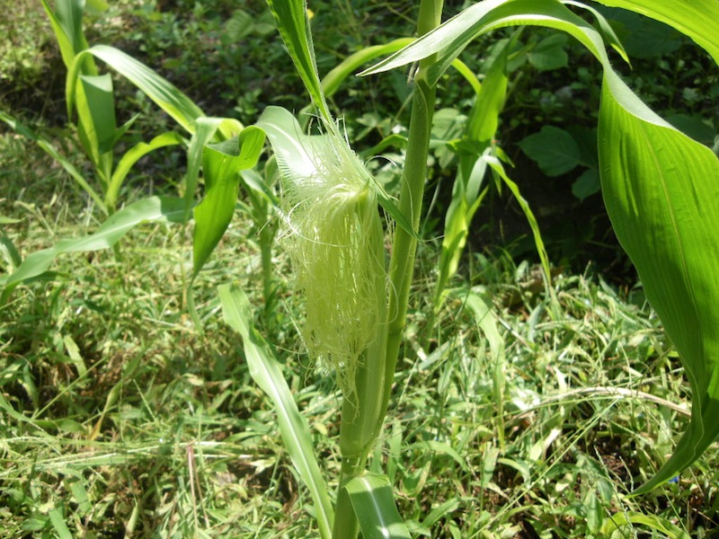 なかなか成長しないとうもろこしもやっと雌花が咲きました。トウモロコシは一株の中では必ず雄花が先に咲いてしまうので少しづつずらして種を蒔いているので先の物から順番に咲いて実になる予定です。