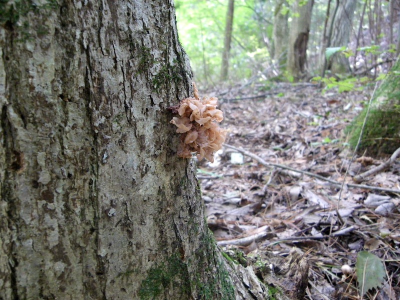 ハナビラニカワダケ。木肌に張り付くように育つ変わったきのこ。上を見上げるとポツポツと取り付いています。プリプリとした食感で汁物に入れると美味しい。