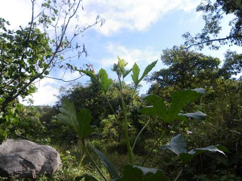 最後の一段の花おくら。最後の花は摘まずに実にしてみました。実は固くて食べられないのですが種採り用です。