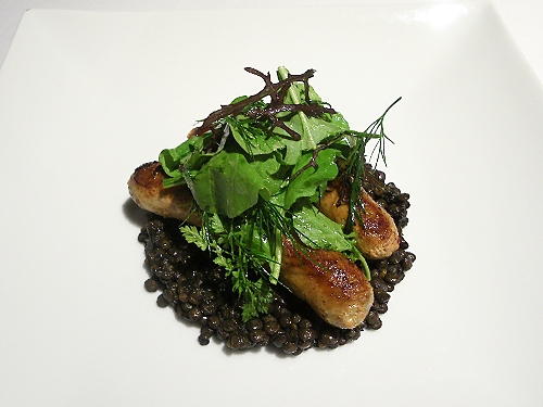 写真のお料理はメインディッシュの「塩山産ワイン豚の自家製ソーセージ、レンズ豆の煮込み添え」です。