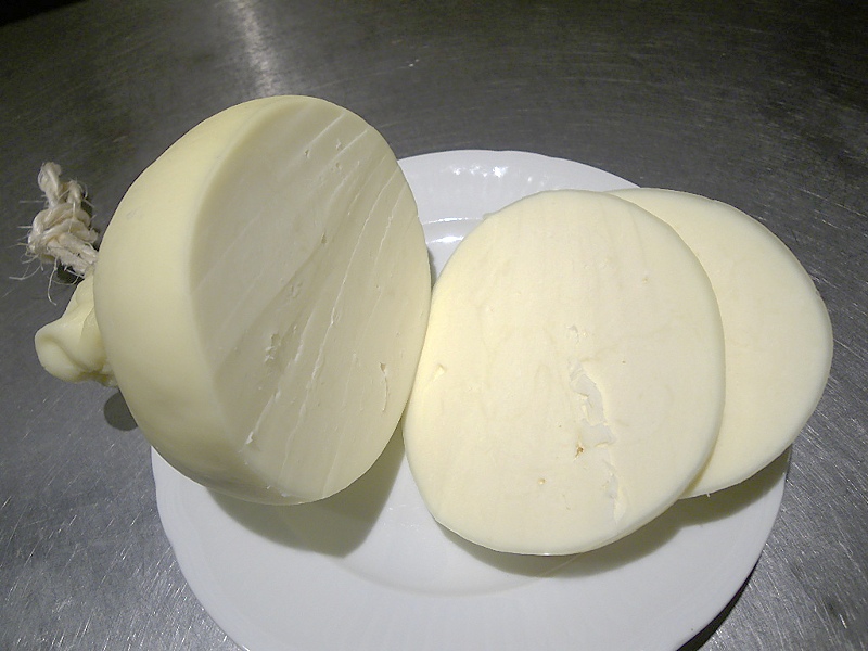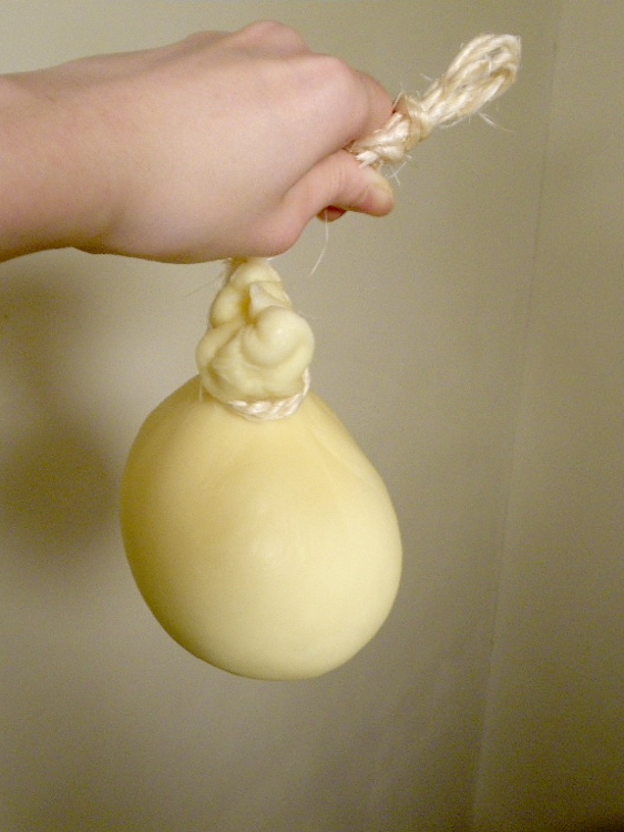 チーズの種類としては「パスタフィラーラ」と呼ばれるモッツァレッラチーズと同じような作り方をするチーズです。イメージとしてはモッツァレッラチーズに塩をしっかりして紐で吊るし水気を抜いて熟成させた感じでしょうか。この形は袋などに入っているわけではなくてチーズを直接紐でくくっているんです。大きさは約750g、結構重いです。