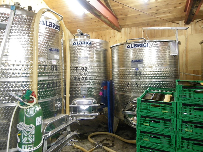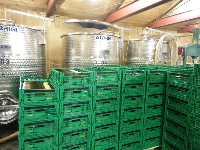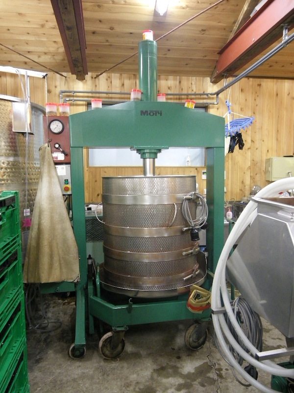 これは実はこだわりの圧搾機だそう。多くのワイナリーは横型の圧搾機を使っているのですがこれは昔ながらの方法に近い縦型。手間と時間がかかるけど納得の果汁が得られるそう。この機械には白ワインなら生のぶどうの実を、赤ワインなら発酵が済みワインになった果実と果汁を入れて搾ります。
