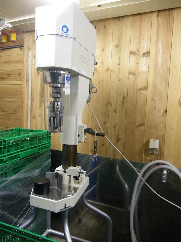 で、次の人がこの機械でキャップを締める。そこまでしたら箱にどんどん入れていって別の日にラベルを張って完成です!手作りですね〜!