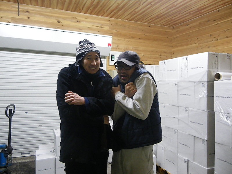 仕事の邪魔をしてしゃべってないで品物をもらって帰らないと!奥の方にある注文したワインの発掘中。