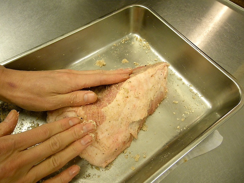 「ワイン豚の生ハム」骨付きの大きなバージョンも仕込むのですが、これは比較的すぐ食べられるブロックタイプの物。まずは塩やスパイスを揉み込み塩漬けにします。