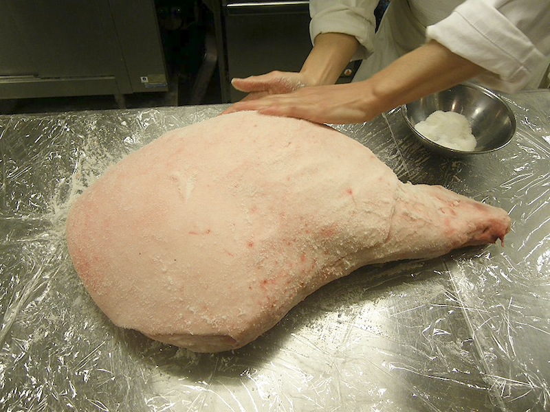 骨付きワイン豚の生ハム作り 自家製 2012.12.18 先日はブロックの生ハムを仕込んだのですが、今回は骨付き生ハムの仕込みです。まずは塩と砂糖を揉み込み下漬けをして水分を抜きます。 実は去年も同じく骨付きで仕込んだのですがまだまだ熟成中でして、去年の分が成功しているかどうかは不明なのです。無事に夏は乗り越えられているとは思うのですが… 去年分の完成は2013年の夏から秋頃かな?なので今回の仕込みは2014年分なのです。気が長い話ですね…