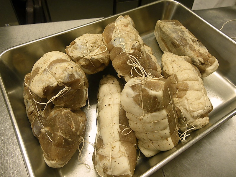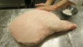 ワイント豚の生ハム作りその後 自家製 2012.12.22 先日作り始めたワイントンの生ハムです。塩とスパイスでの漬け込みが終了しました。出てきた水分を洗って一時間流水で塩抜きします。さらに一晩脱水シートで水分を取りました。 凧糸で吊るしやすいように括っていよいよ熟成開始です!