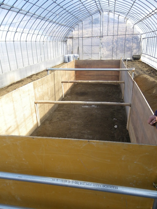 これは今年からの新しい試みとしてこの枠の中で落ち葉の堆肥を作るそうです。堆肥作りの際にかなりの発酵熱がでるのですがその熱を利用し、早春の時期の育苗をするそうです。寒い時期に育苗するのは難しく、昨年までは早い時期には市販の苗を買っていたのだそうですが、市販の苗はひ弱で育ちが悪かったそうです。今年は早い時期から自分で育てた苗を使える予定だそうです。