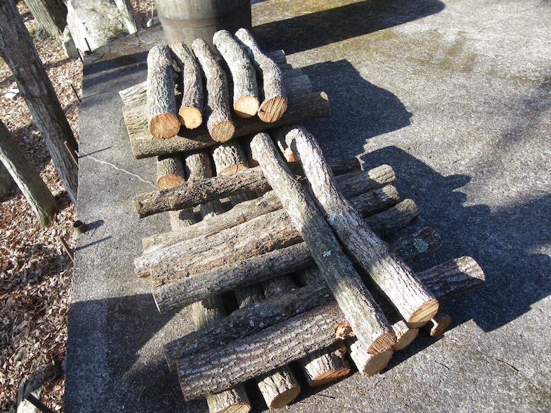 去年も木を分けてもらった山梨市の林業会社から木を運んできました。もうちょっと暖かくなったら菌を植え付けます。今年はシイタケ15本とナメコ15本を作る予定です。
