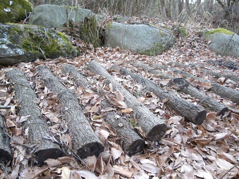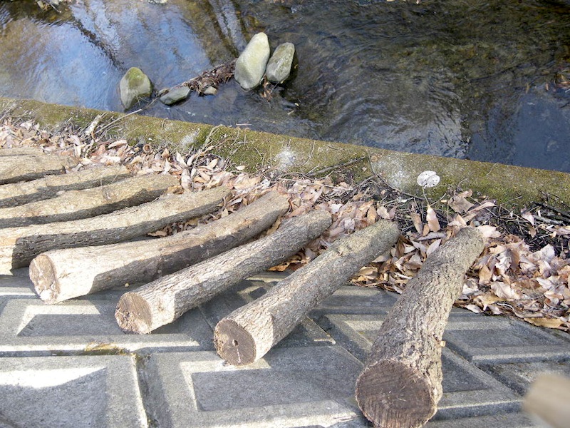 こっちはシイタケ。少し風通しの良い所に立ててあります。発生の前に木全体をしばらく水に浸すと上手く行けばシイタケが出てくるらしい。菌が回っていれば今年の春から収穫も可能らしいですがどうなんだろ〜?