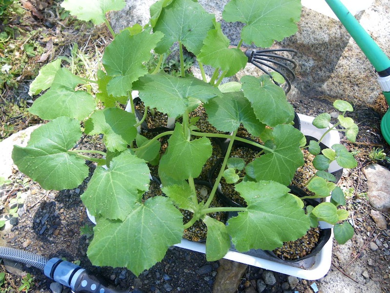 この畝にはズッキーニとオクラを交互に。
