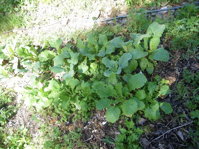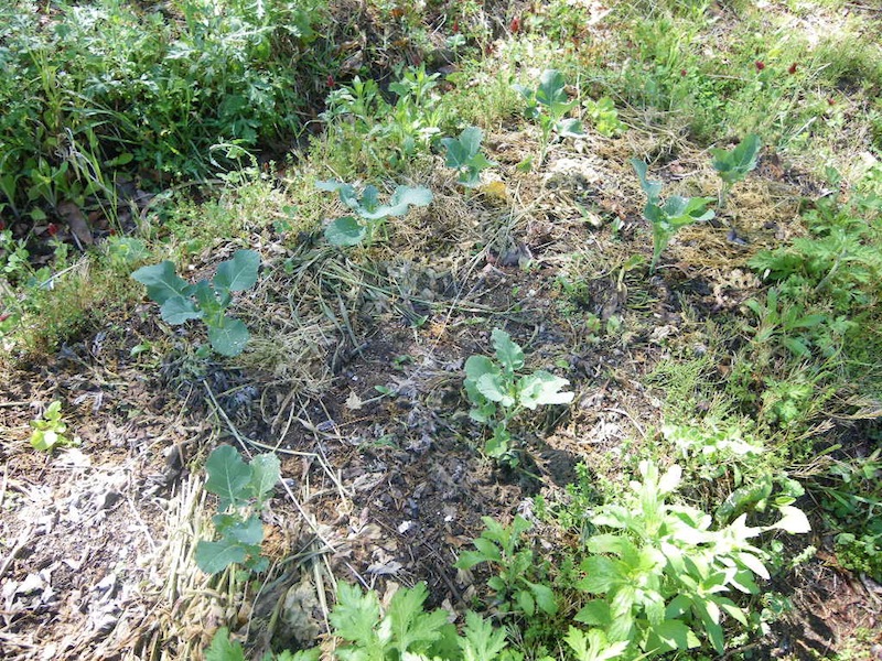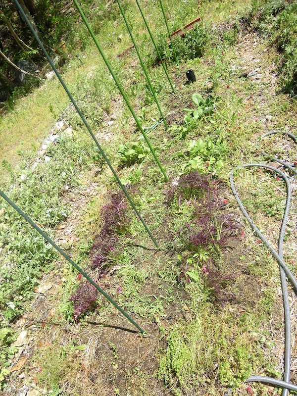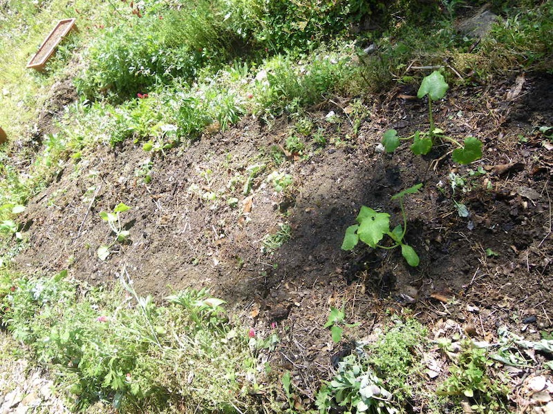 この畝にはナスとシソとピーマンを。あとで両側に枝豆とインゲンも蒔きます。まだ菜っ葉が繁っているので真ん中だけ収穫して、両側の菜っ葉はもうしばらく使って行く予定です(テキトー農法なので…)