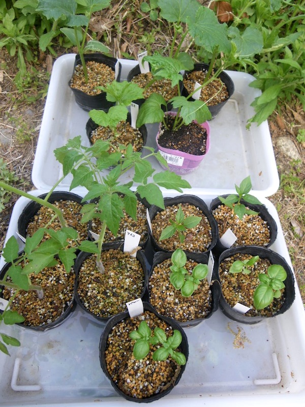 ミニトマト、唐辛子、バジル、キュウリ、ゴーヤーです。ゴーヤーが一株だけ上手く発芽しなかったので買ってきたのですが他は種から苗を作りました。