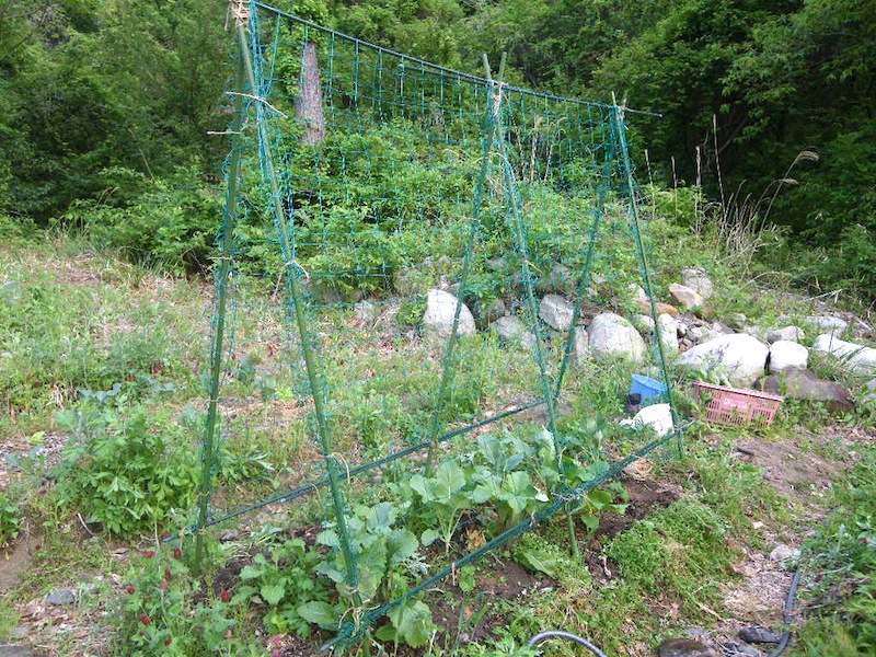キュウリとゴーヤーは支柱を立ててネットを張って。畝の中にはまだカブやコールラビが植わっていますがキュウリとゴーヤーが大きくなる頃には収穫を迎えているでしょう (;^_^A