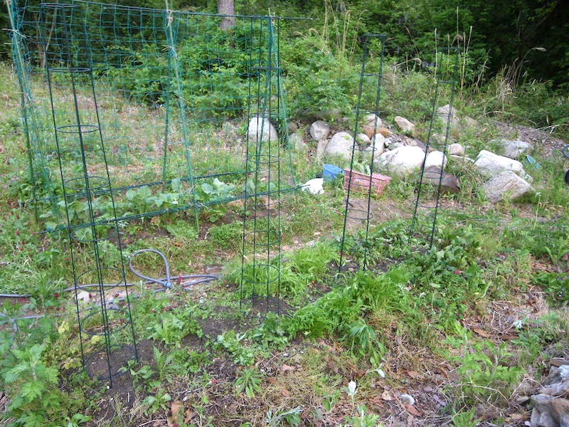 ミニトマト、バジル、唐辛子の畝。ミニトマトは去年円形の支柱がいい感じだったので今年もこれで行きます。あとはミニトマトの畝の肩に落花生、ナスの畝の肩に枝豆、インゲン豆をズッキーニの畝にラディッシュの種を蒔きました。