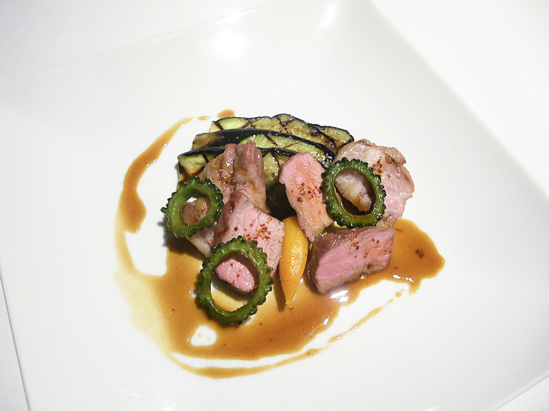 写真のお料理はメインディッシュの「塩山産ワイン豚肩ロースのロースト、季節の野菜添えペドロヒメネスのソース」です。