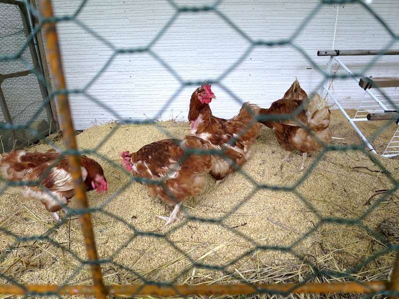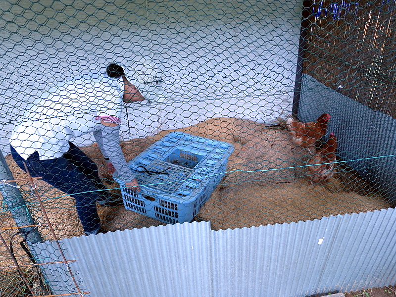 小屋が完成して楽しみに待つ事数日、ニワトリが到着しました!!採卵用のニワトリは一年経つと効率が悪くなるため破棄されるのでそのニワトリを譲ってもらったそうです。運搬用の箱の中からニワトリが登場しました。