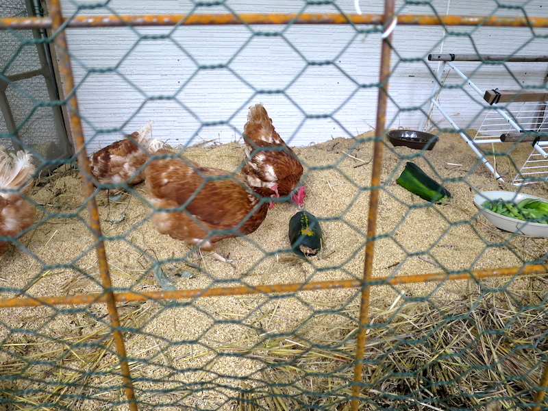 小山田さんの作った育ちすぎのズッキーニをやると突き回していました。