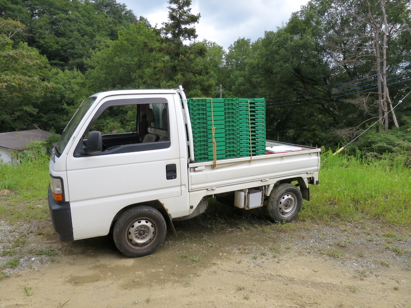 軽トラックにはすでに収穫箱が積まれています。