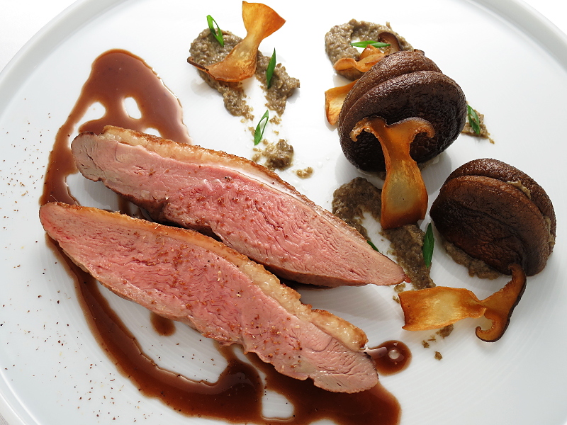 写真のお料理はメインディッシュの「鴨胸肉のロースト天然山椒風味、塩山産赤ワインのソース原木しいたけ、シャンピニオンデュクセル、エリンギチップ添え」です。