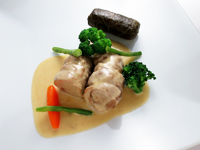 写真のお料理はメインディッシュの「仔牛のクリーム煮、ぶどうの葉で包んだ黒米のバターライス添え」です。