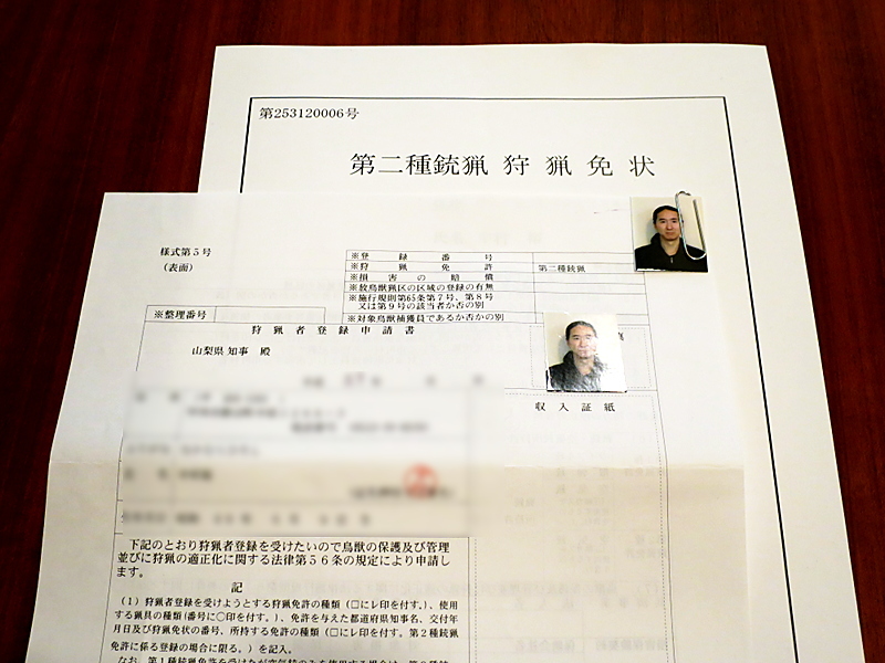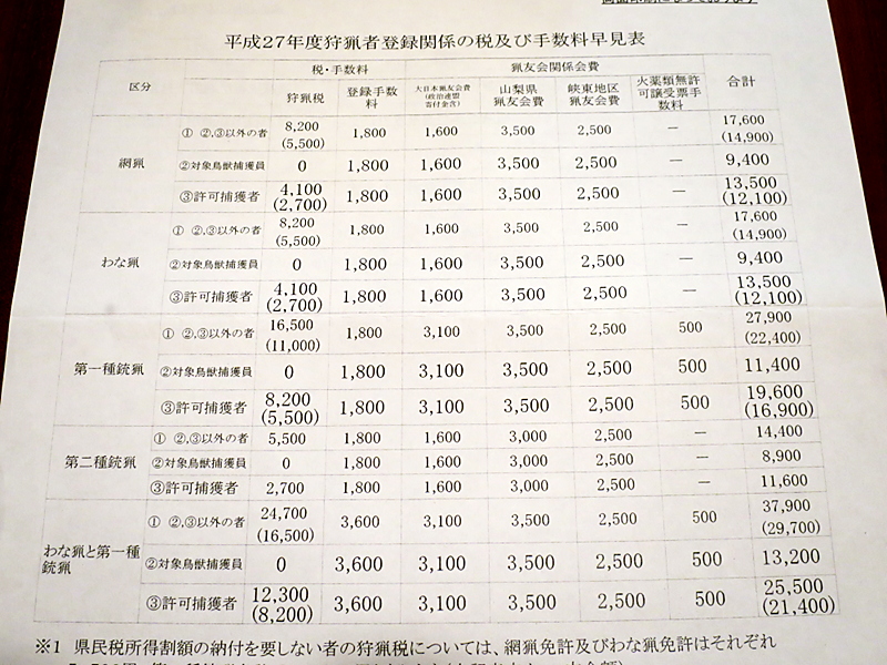 そして狩猟税と手数料を支払います。狩猟税は「釣り券」の様な物で狩猟を行う都道府県ごとに毎年登録をして支払う必要があります。たとえば山梨と長野でまたがって猟を行う場合は両県に狩猟税を払う必要があります。空気銃は「第二種銃猟」になるので猟友会の会費も合わせて一年14.400円ですね〜散弾銃(第一種銃猟)や、わな猟も一緒だと結構お高いです。