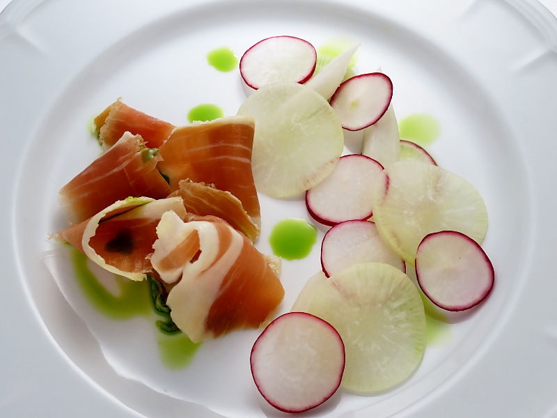 先日ご紹介した34ヶ月熟成の自家製生ハムを使ったお料理です。薄くスライスした生ハムのしっとりとした食感と歯ごたえの心地よいラディッシュの組み合わせ。ハーブの香りのオイルがアクセントです。