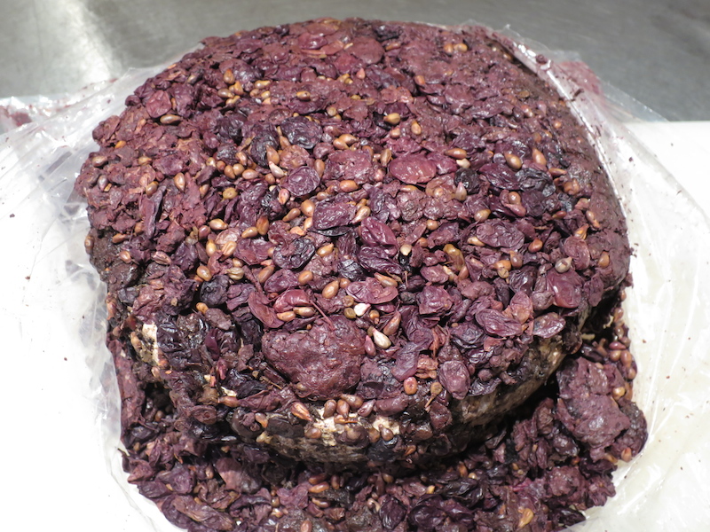 搾りかすをよけて切ってみました。皮は水分でふやけてしっとりと柔らかくなっています。ワインの色はあまり染みていないですが風味はかなり染みています。一切れ口に入れると熟成したチーズとワインのアルコール感が一体となって広がります。赤ワインが欲しくなる!というか、赤ワイン無しは考えられない!といったお味です(笑)
