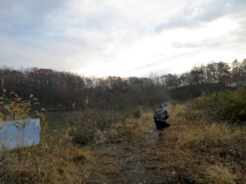 身を屈めてそーっと覗き込んで水面の波紋などを見て鳥が居るか観察します。鳥がいたらそれが撃ってもいい鳥かどうか確認します。(←これ超大事)ハンターになるには野鳥の知識や観察眼も必要なんですね。