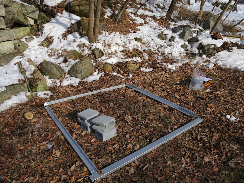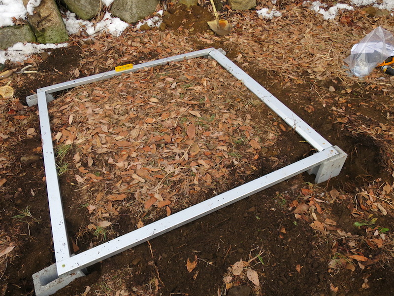 下側の枠だけ組み立て設置場所を決めたら四隅にハーフサイズのブロックを埋めます。この辺りは大小の石がごろごろ埋まっているので結構大変。なんとかブロックが埋まるだけの穴を掘りました。水平器を使って一応の水平は出してあります。