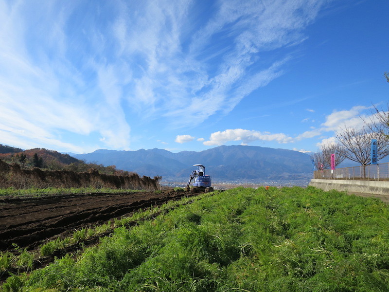 まず向かったのは市川三郷町です。お目当てはここの地域の名産「大塚にんじん」。小高い丘になった大塚地区に近づくと畑が目につくようになります。畑の中にナゼかユンボが!?大塚人参はこの地域の郷土野菜なのですが、めちゃくちゃ長いのが特徴なんです。なのでユンボを使って収穫を行うんだとか。ちょっとびっくりですよね。