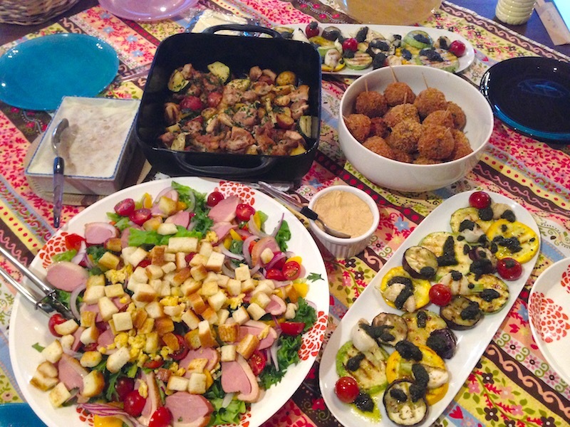 お料理も持ち寄りで♪エリソンからは「鶏と新じゃがとズッキーニと新ニンニクのオーブン焼き」「香茸のライスコロッケ」。他のお料理も美味しかったです♪
