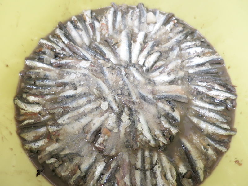 程よく漬かったら使うぶんだけ取り出し塩抜きしながら手で内臓と骨を外してオリーブオイルに漬けて完成です。使い始められるのは秋頃かな〜完成をお待ちください!