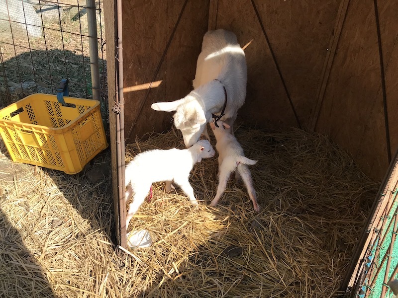 二頭めも元気そうです。舐めているとすぐに毛がふわふわになってきますね。子ヤギたちも何かを探すような仕草。本能的におっぱいを探しているみたいです。