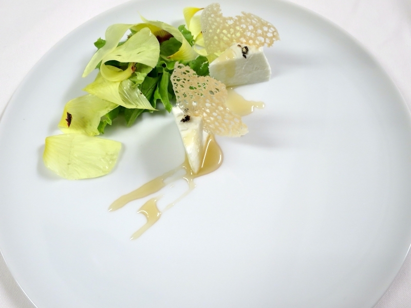 飼ってるヤギのミルクを使った自家製シェーブルチーズと。甲州市塩山で生産されている貴重な「日本みつばちの蜂蜜」を使ったお料理です。優しいミルクの風味のチーズ、やや酸味があり複雑な味わいの蜂蜜、黒胡椒のピリリのした辛味がアクセントです。