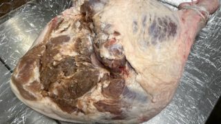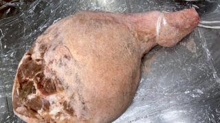 年末は生ハム作りの季節!最初の塩漬け作業や乾燥作業は寒い時期じゃないとできないので、毎年12月中ばごろに仕込みが始まります。ワイン豚の骨付きもも肉を用意します。骨付きで10kg以上のサイズなのでかなり大きいです。最初に不要な骨を外して形を整…
